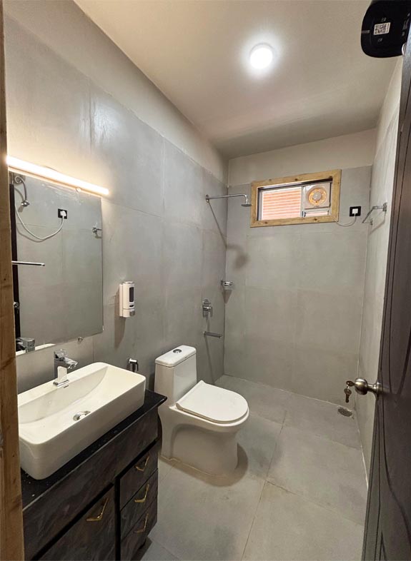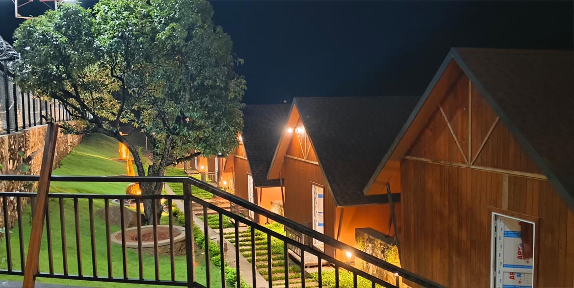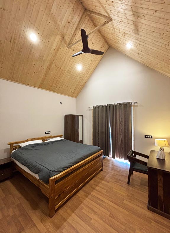 1. 5 beautifully crafted wooden cottages offer cozy double luxurious occupancy options. Each cottage boasts an attached, state-of-the-art Western bathroom fitted with modern amenities, including geysers for a warm, comfortable stay amidst nature’s charm.